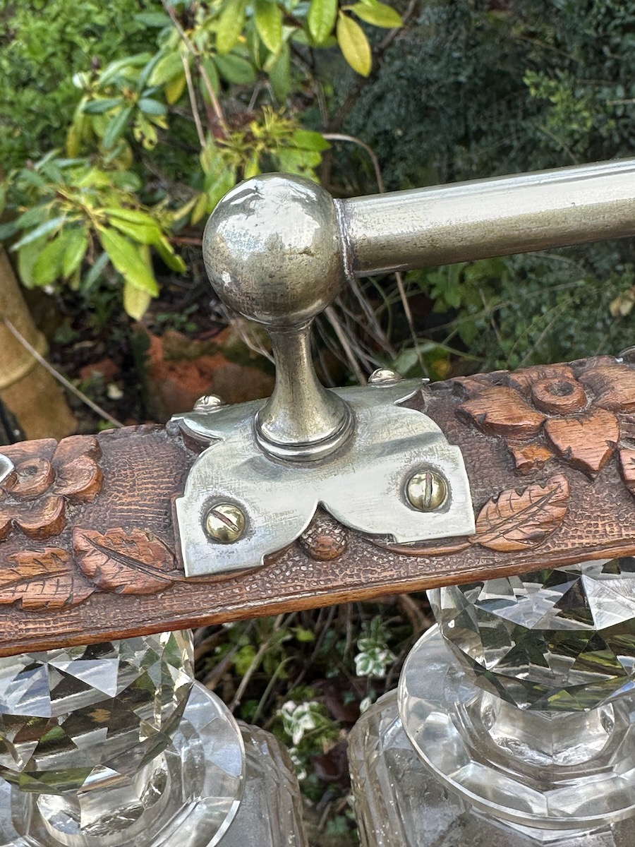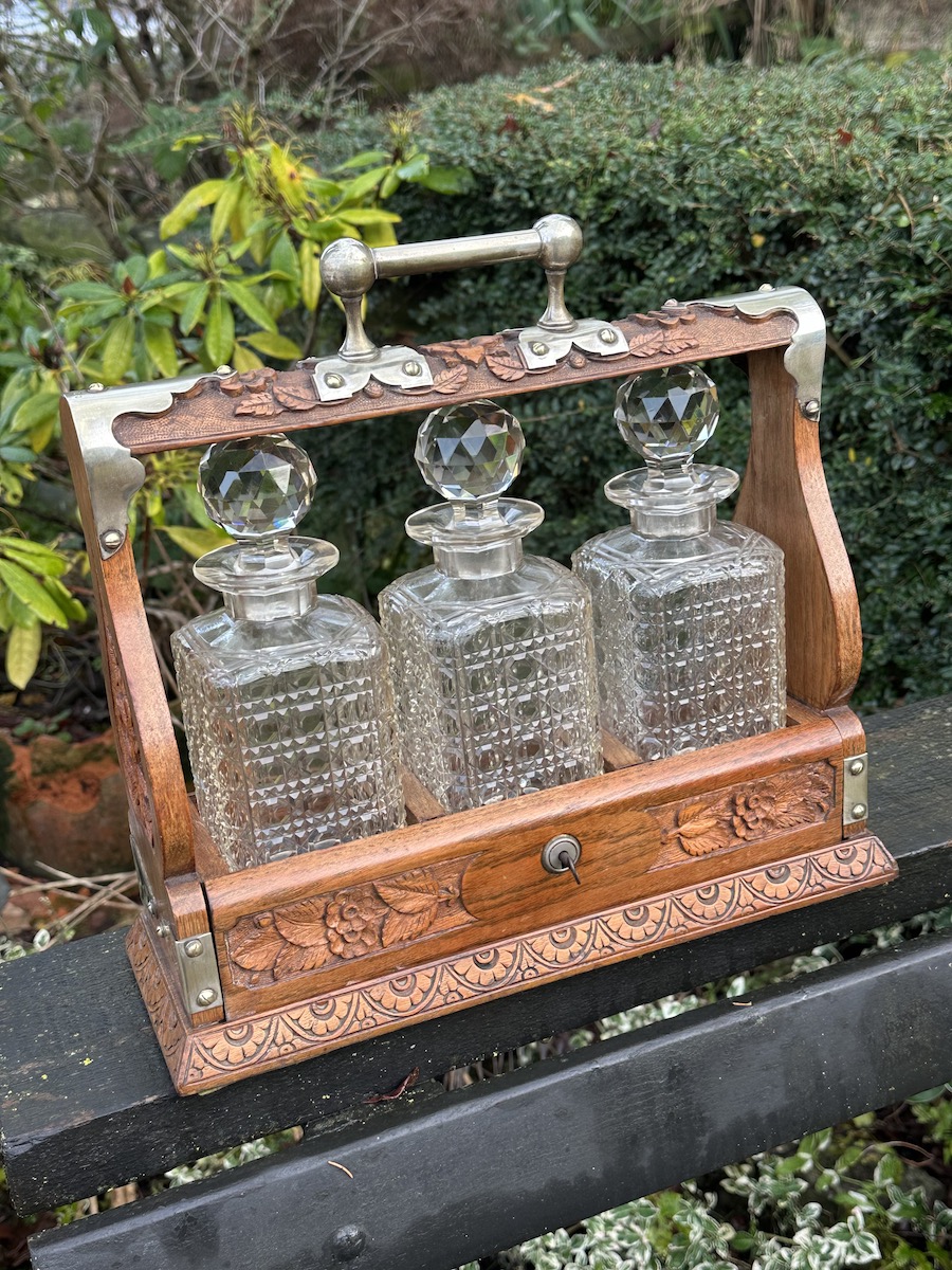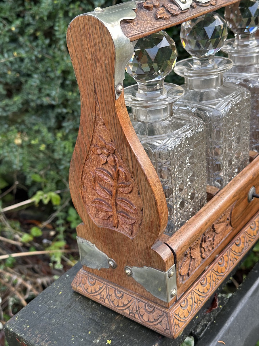 Victorian Carved Oak Tantalus with Silver Plate Trim & 3 Cut Crystal Decanters
